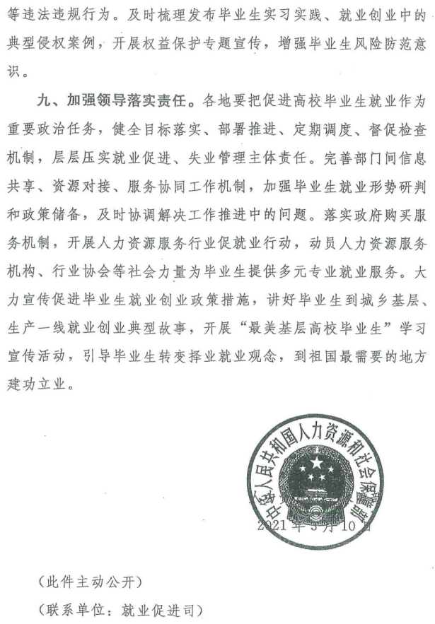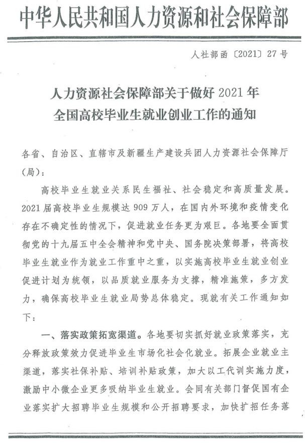 今年,我省2021届高校毕业生将突破50万人,促进高校毕业生就业任务更为艰巨。为进一步做好高校毕业生就业创业工作,确保毕业生就业局势总体平稳,现将《人力资源社会保障部关于做好2021年全国高校毕业生就业工作的通知》(人社部函〔2021〕27号)转发你们,并提出如下贯彻意见,请一并抓好落实。