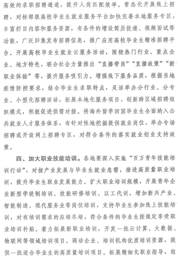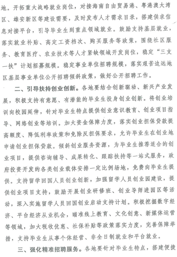 一、全面落实一次性吸纳就业补贴、一次性求职创业补贴、灵活就业社保补贴、创业补贴、创业担保贷款等扶持政策,支持高校毕业生多渠道就业。紧抓实施乡村振兴战略机遇,在农业农村积极拓宽就业新空间,引导高校毕业生到基层就业。切实加强与国资等部门的沟通衔接,鼓励地方国有企业扩大对我省高校毕业生的吸纳规模。