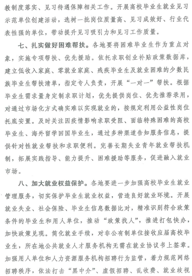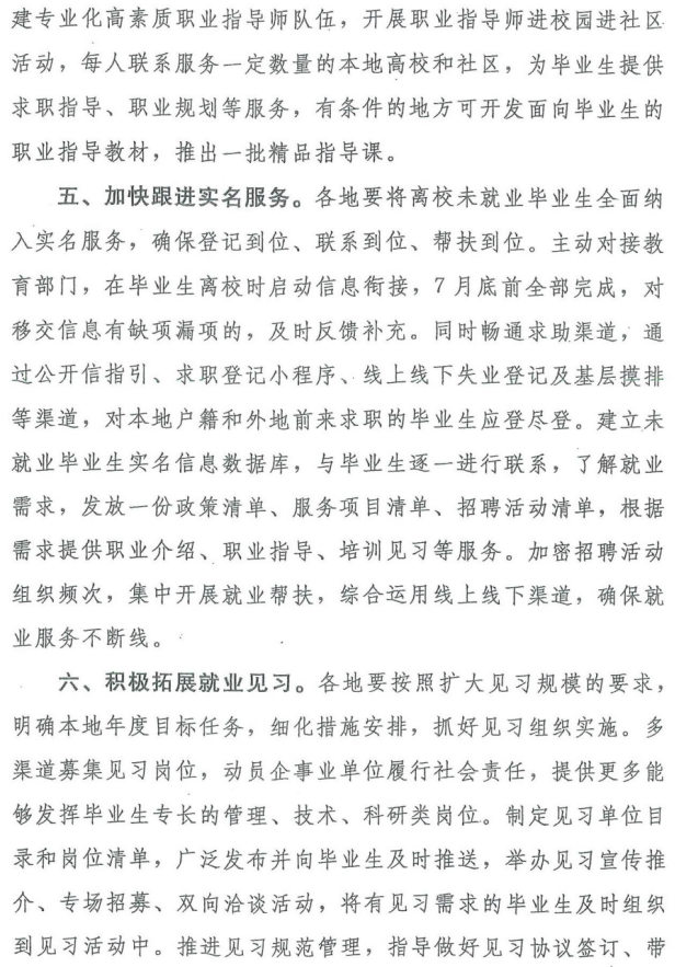 四、切实做好人力资源社会保障部“未就业高校毕业生求职登记小程序”平台中,登记毕业生的联系服务工作。推进“高校毕业生就业服务打包办”,证明材料“应减尽减”,为高校毕业生提供通办、智慧、优质公共就业服务。募集更多能够发挥毕业生专长的管理、技术、科研类岗位,进一步强化就业见习政策宣传、供需对接、待遇保障,确保今年就业见习目标任务完成。
