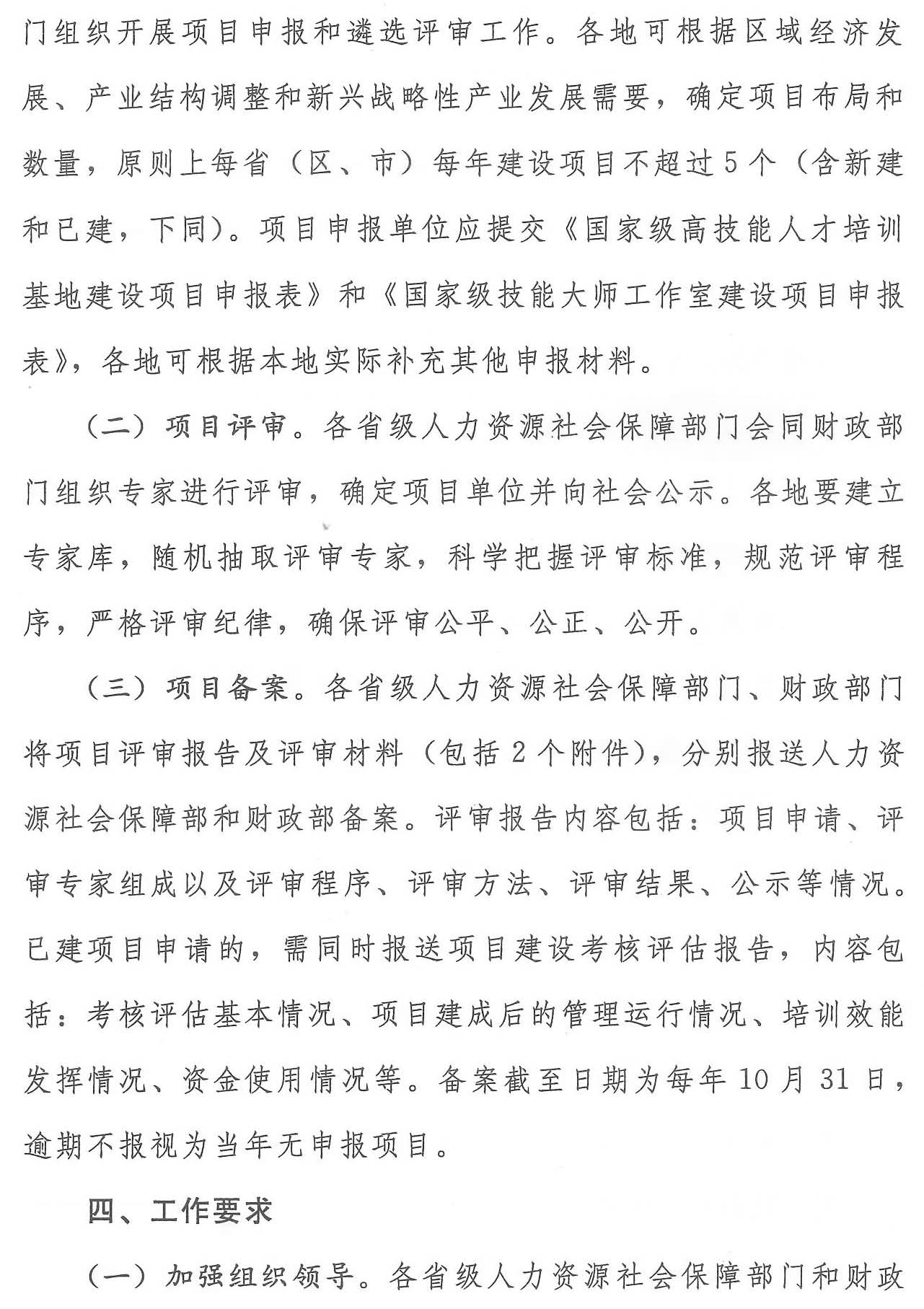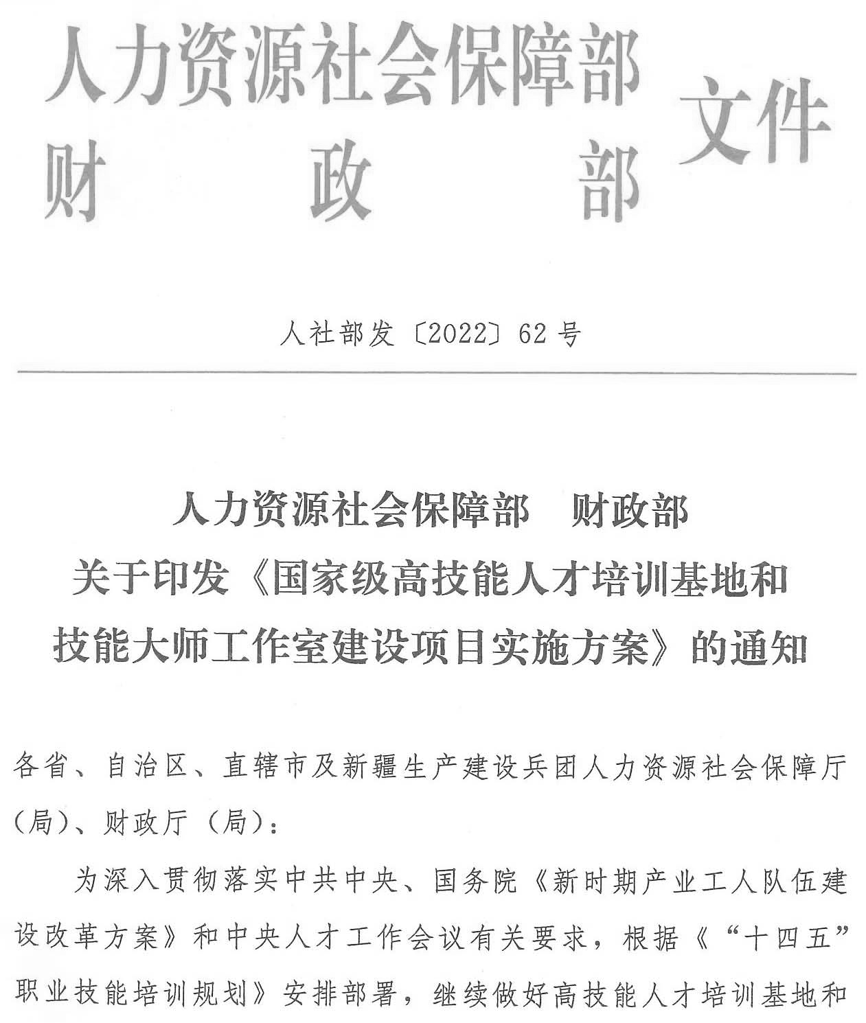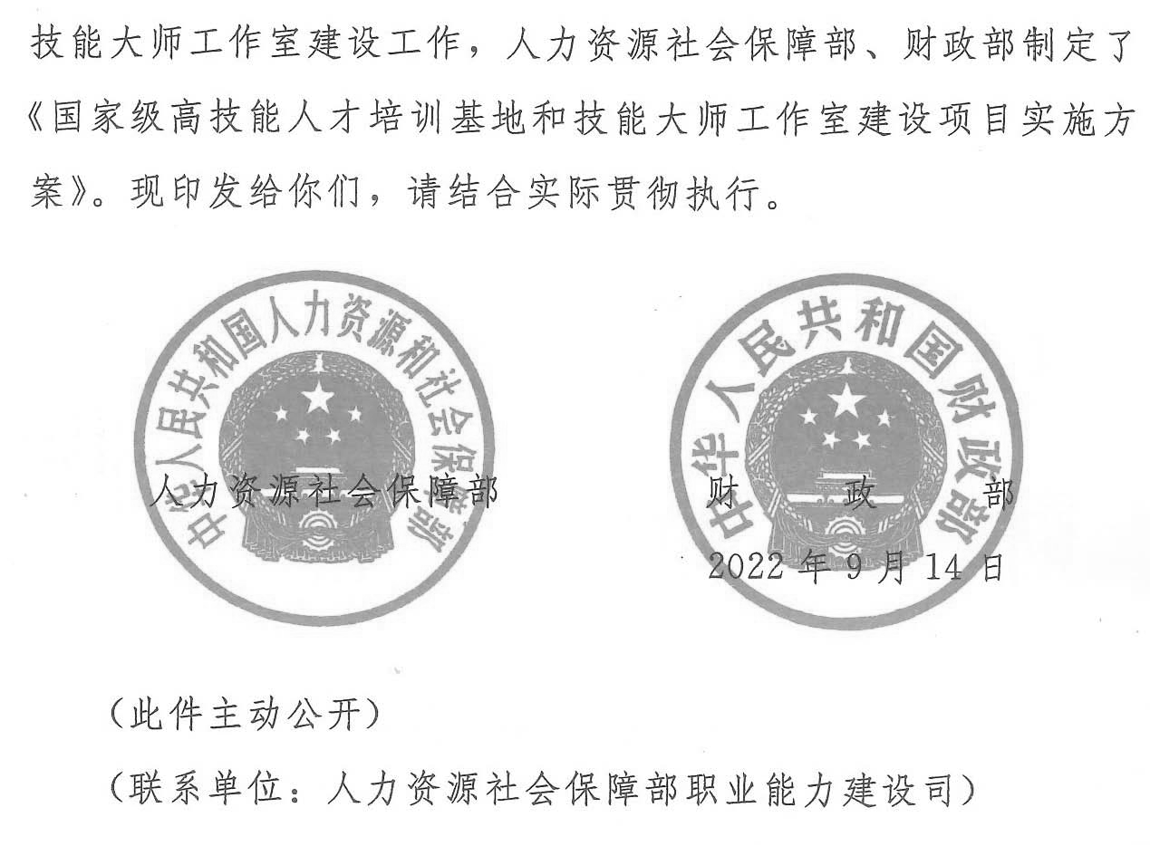 现将《人力资源社会保障部财政部关于印发〈国家级高技能人才培训基地和技能大师工作室建设项目实施方案〉的通知》(人社部发〔2022〕62号,以下简称《实施方案》)转发你们,请结合实际和以下工作要求贯彻执行。