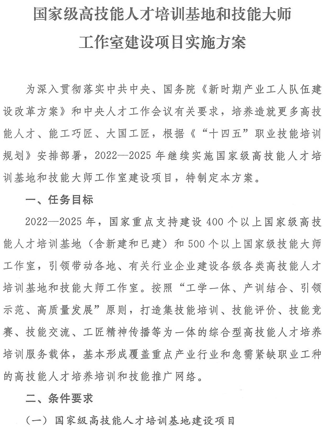 2022年至2025年期间,全省每年拟建设国家级高技能人才培训基地项目和国家级技能大师工作室项目各5个。