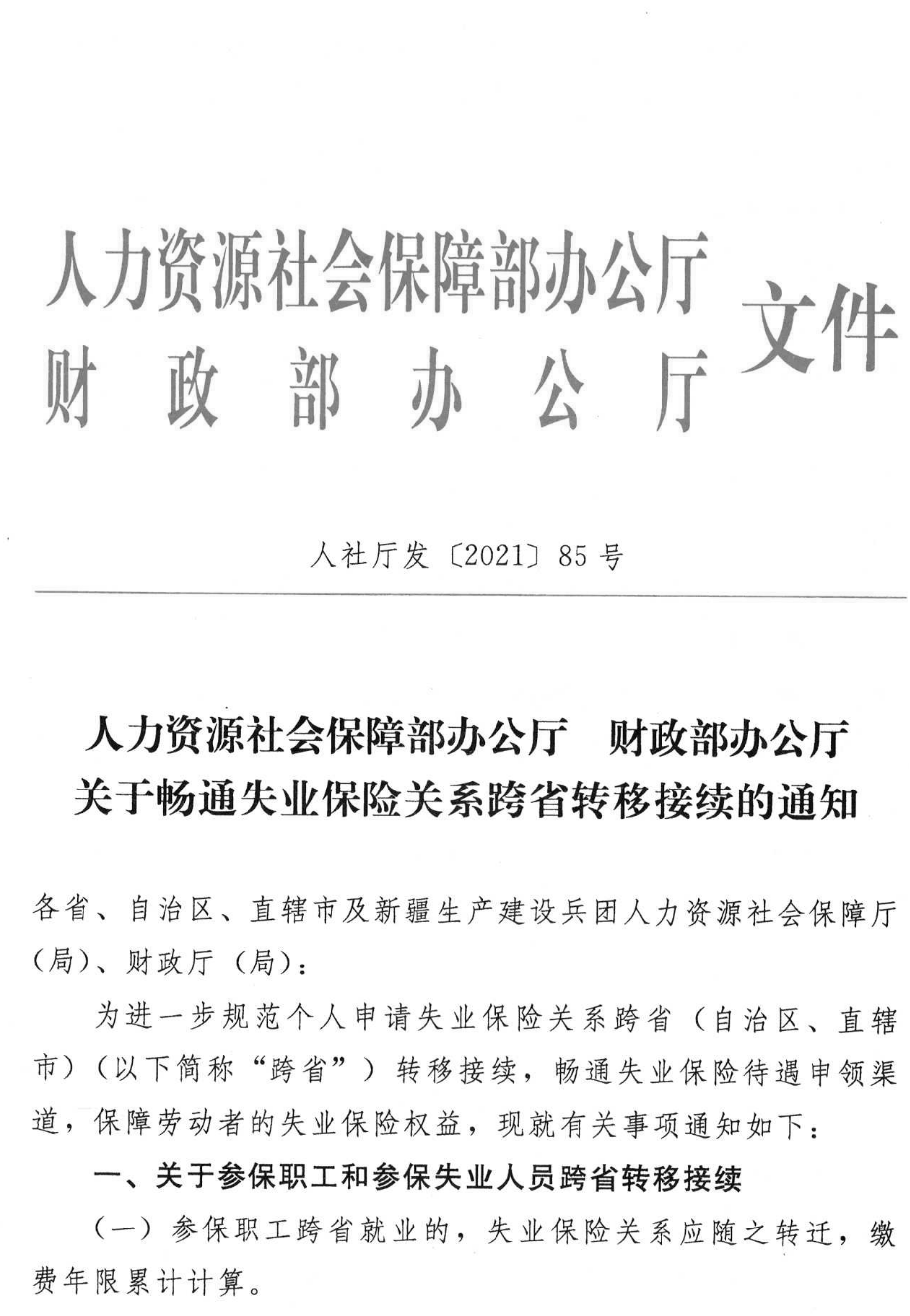现将《人力资源社会保障部办公厅财政部办公厅关于畅通失业保险关系跨省转移接续的通知》(人社厅发〔2021〕85号)转发你们,并提出如下意见,请一并抓好贯彻落实。