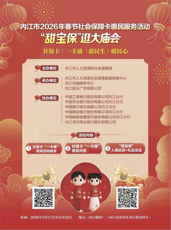 2026年春节期间,内江市人力资源和社会保障局将联合多家银行,共同推出“甜宝保逛大庙会”社保卡惠民服务活动。此次活动旨在进一步宣传社会保障卡“一卡通”功能,拓展应用场景,让市民在欢乐祥和的节日氛围中了解社保卡、用好社保卡。